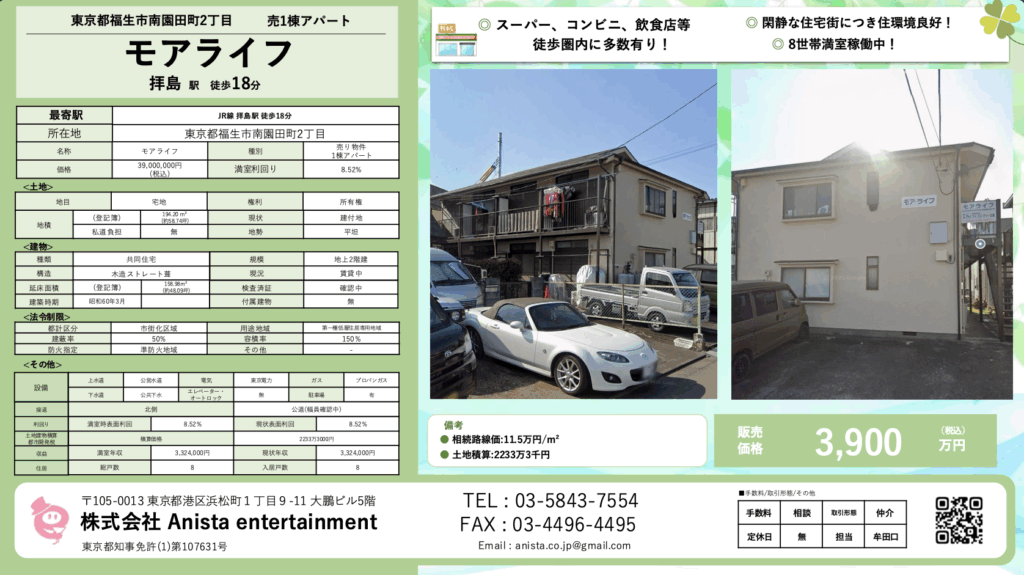 東京都福生市南園田・現状満室利回り8.52%・積算約2,230万・木造1棟AP
